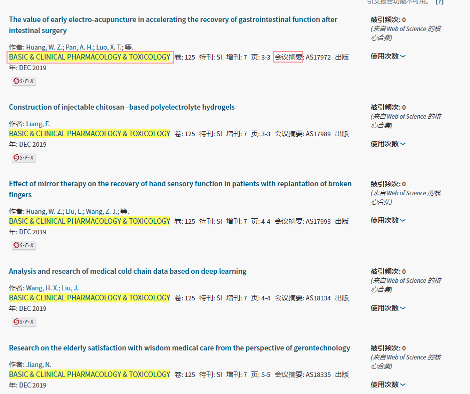 Note: 长篇摘要发表至SCI期刊并被SCI数据库收录后,有独立的WOS检索号,有期刊卷期、页码信息,期刊影响因子,能被其他出版物引用,可在任意查新工作站开出检索证明。与全文的检索证明不同的是, SCI长篇摘要检索的类型为会议简报Meeting Abstract,不会有具体的会议信息。因此,不是会议的SCI检索。